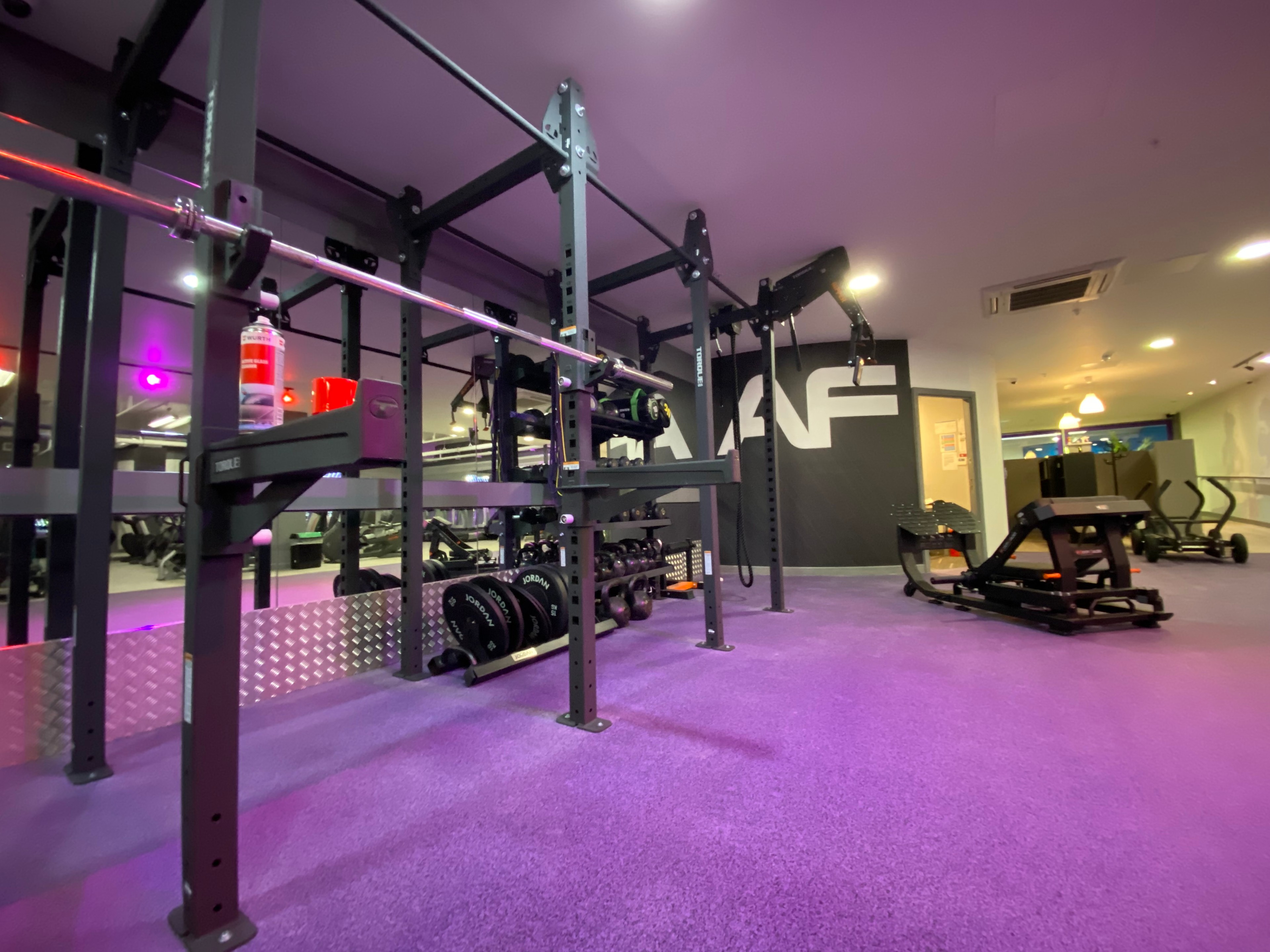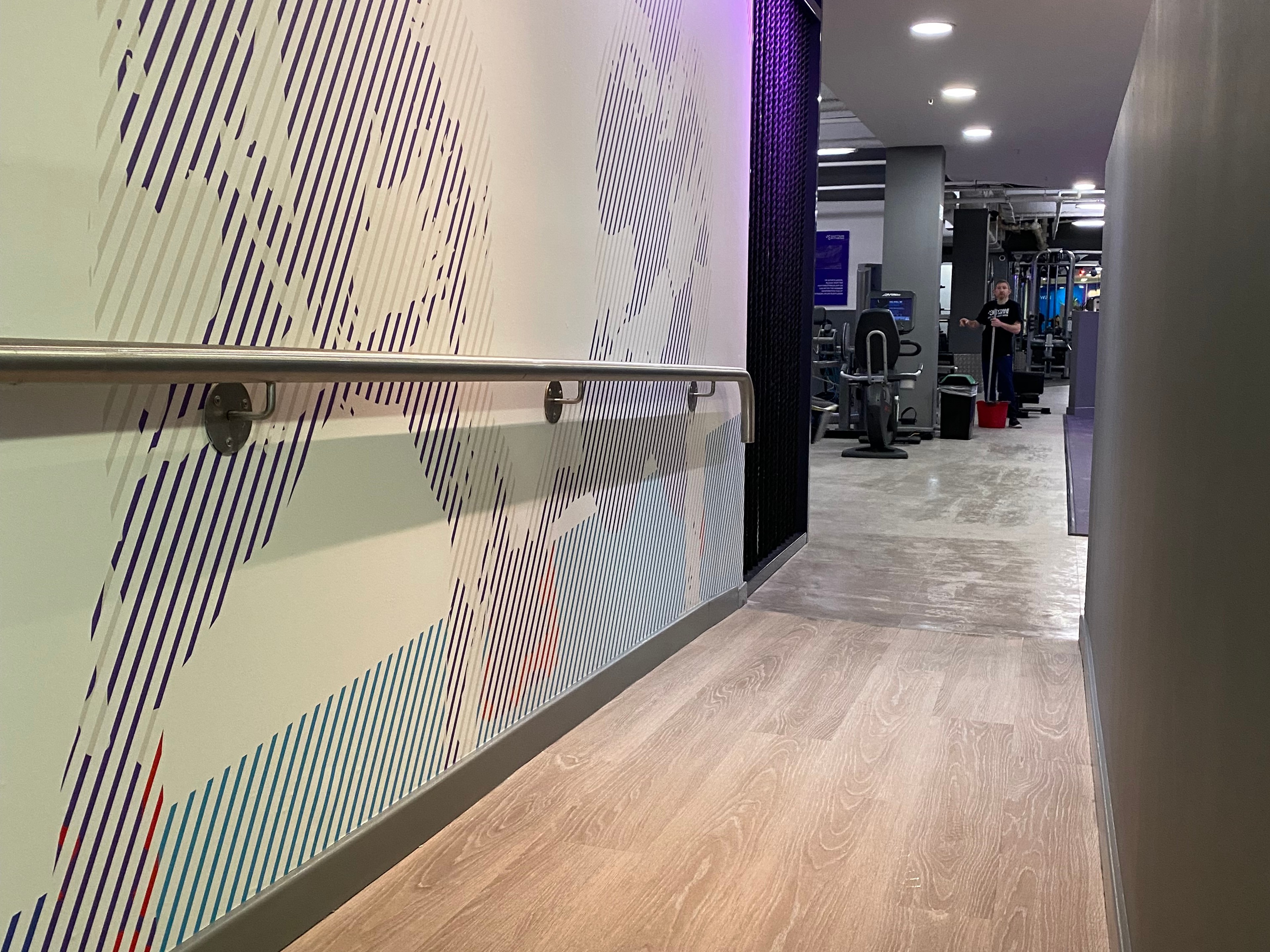 We installed new flooring throughout they gym removing the old dated carpet tiles, ceramic tiles and sheet vinyl and installing new luxury Vinyl Tiles (LVT) in a concreate finish and also a limed wood finish. We also installed new rubber roll flooring in a purple brand coloured finish. and extended the heavy duty free weights flooring to form a larger area.